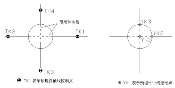 在設(shè)計(jì)圖紙上根據(jù)各預(yù)埋件的結(jié)構(gòu)中線確定YK1、YK2、YK3的位置,獲得其坐標(biāo)值,在預(yù)埋件上做出YK1、YK2、YK3的標(biāo)志。用全站儀極坐標(biāo)法線定位YK1點(diǎn),確定預(yù)埋件的中點(diǎn)位置,再用同樣的方法測(cè)定YK2、YK3的位置,控制預(yù)埋件的軸線方向。